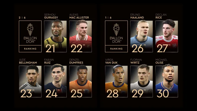 Para as categorias principais de melhor jogador e melhor jogadora, a Bola de Ouro divulgou uma lista inicial de 30 indicados em cada. Ao longo do dia, porém, os perfis oficias da premiação passam a revelar os atletas que ficaram entre a 30ª e a quarta colocação. Veja a seguir: