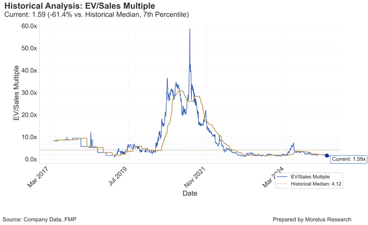 Nosso preço-alvo de US$ 8 é baseado em um múltiplo EV/Vendas futuro de 4,0x aplicado à estimativa de receita para FY26 de US$ 260 milhões, o que implica um potencial de valorização de 362%.