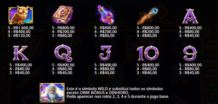 • O Wild é o padrão de jogos de slots, e substitui todos os símbolos regulares. Ele aparece como o grande mago.