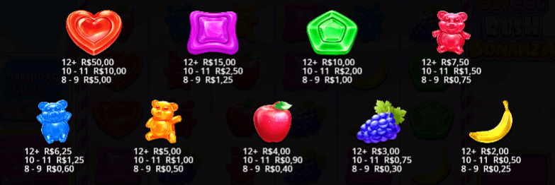 - Símbolos de baixo valor: frutas e ursinhos de goma, que aparecem com frequência.