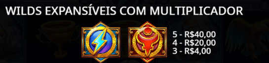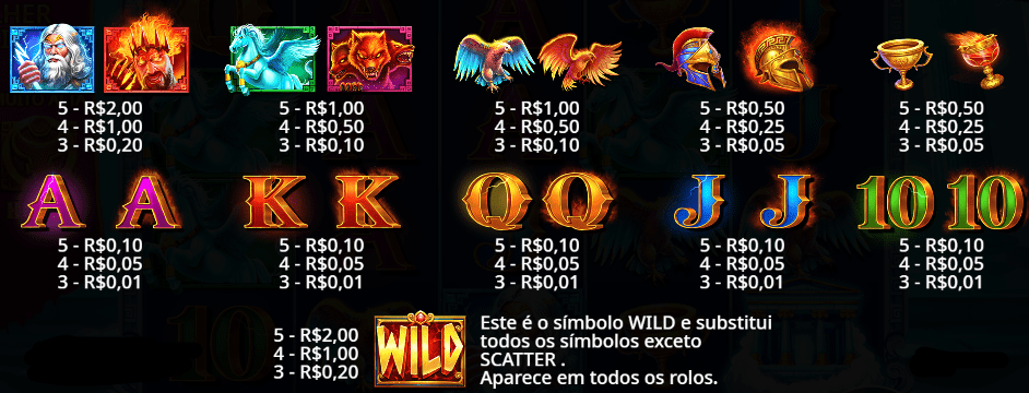 - Símbolos de alto valor: representados por figuras da mitologia grega, como Zeus, Hades e o pássaro . São os símbolos que oferecem os maiores pagamentos.