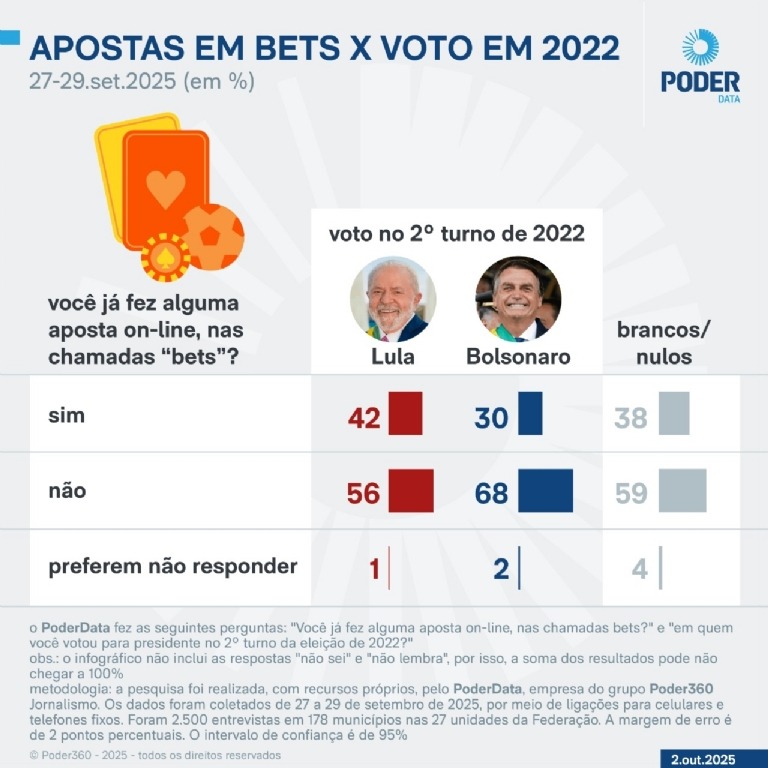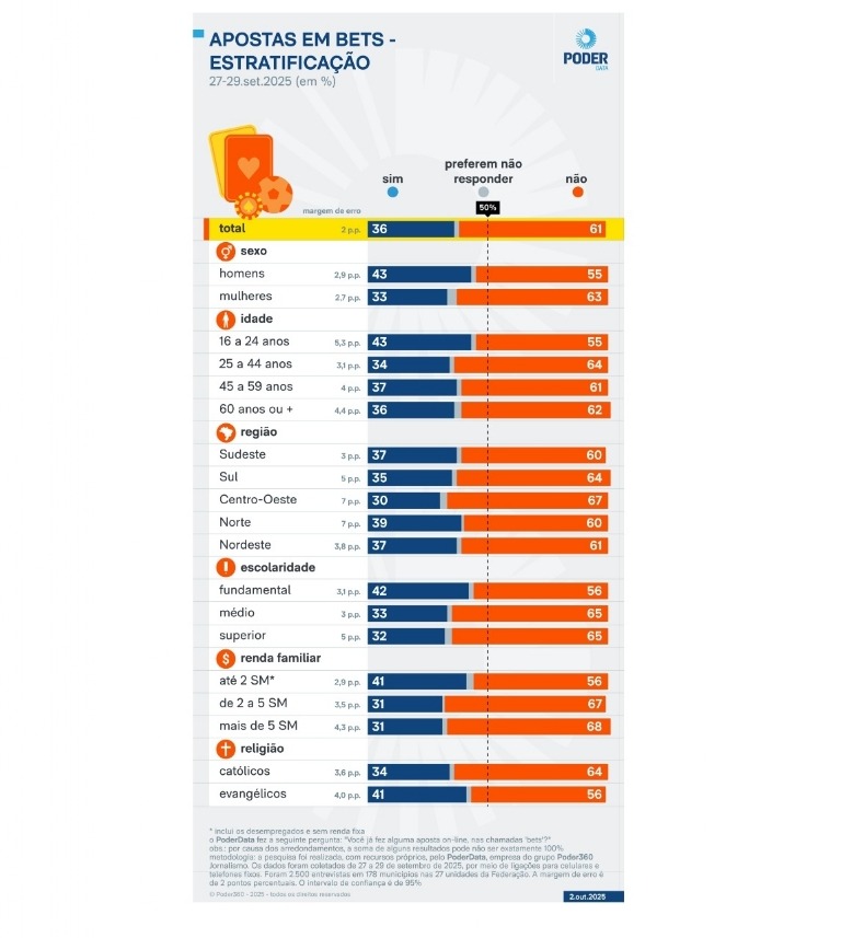 Uma pesquisa realizada pelo PoderData, empresa do grupo Poder360 Jornalismo, indica que o percentual de brasileiros acima de 16 anos que declaram já ter realizado algum tipo de aposta em bets subiu de 24% em outubro de 2024 para 36% em setembro de 2025. Os dados foram coletados de 27 a 29 de setembro, por meio de ligações para celulares e telefones fixos. Foram 2.500 entrevistas em 178 municípios nas 27 unidades da Federação.