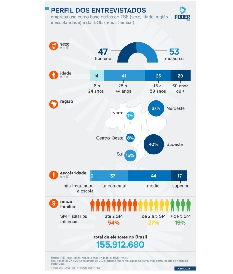 A pesquisa foi realizada pelo PoderData, empresa do grupo Poder360 Jornalismo, com recursos próprios. Os dados foram coletados de 27 a 29 de setembro de 2025, por meio de ligações para celulares e telefones fixos. Foram 2.500 entrevistas em 178 municípios nas 27 unidades da Federação. A margem de erro é de 2 pontos percentuais. O intervalo de confiança é de 95%.