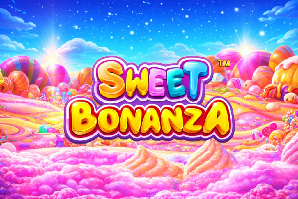 Slot Sweet Bonanza com logotipo colorido em 3D, cenário de doces, corações, pirulitos, montanhas de açúcar e visual vibrante de jogo de cassino online.